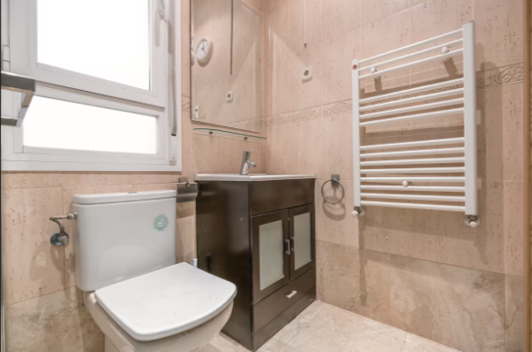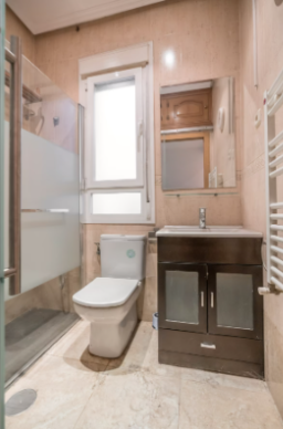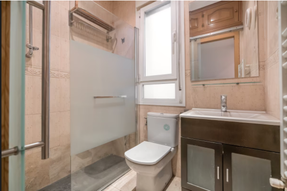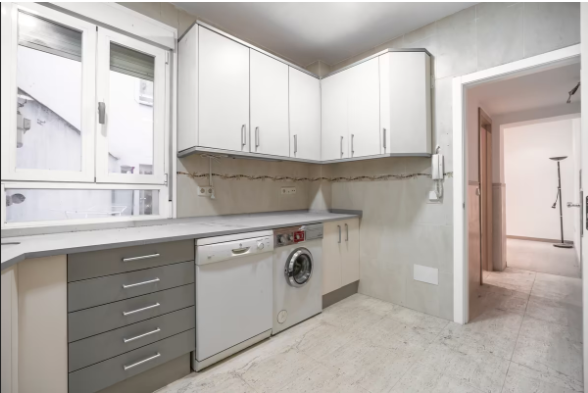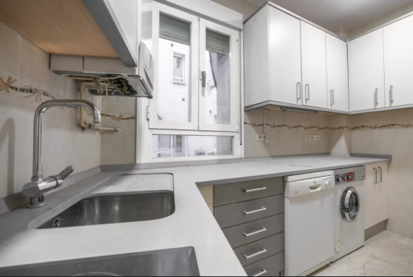 La vivienda, cuya obra se acaba de terminar, consta de Hall de entrada, tres dormitorios, uno de ellos con puerta a un patio y un gran armario empotrado y otros dos dormitorios individuales con ventanas; Salón, Cuarto de baño con ventana y plato de ducha y Cocina equipada con mobiliario y electrodomésticos, prácticamente todo a estrenar excepto la lavadora y con ventana a otro patio interior. El suelos es de parquet, las paredes lisas y la carpintería de ventanas Climalit con doble acristalamiento, Caldera Junkers de gas natural para calefacción y agua caliente, conserje en el edificio y recogida de basuras. A pesar de ser un bajo, está muy bién aislado y ha recibido tratamiento anti humedades en la reforma.